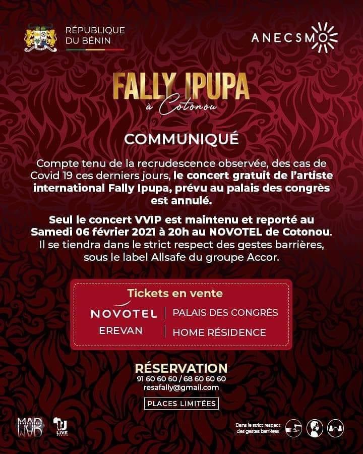 C’est alors que le concert gratuit prévu au palais de congrès a finalement été annulé, seul le concert VIP est maintenu mais reporté à la date du 6 février prochain à 20h au Novotel de Cotonou avec des mesures strictes pour éviter la contamination.