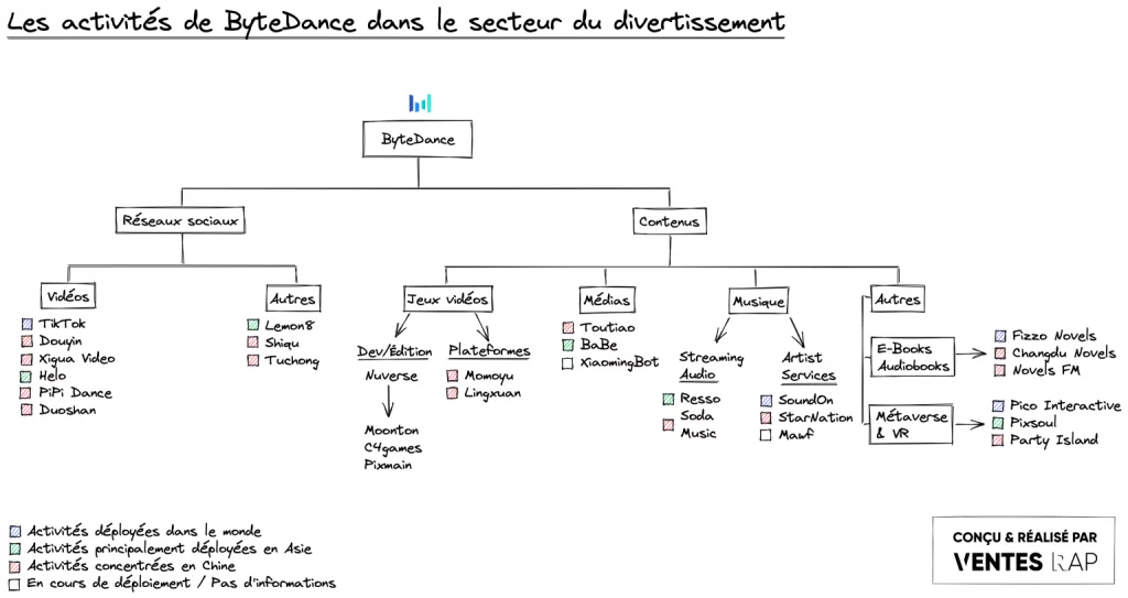 Derrière ses applications les plus visibles en occident, en particulier TikTok, ByteDance a étendu ses activités à de nombreux secteurs en Chine et en Asie, de la santé à la finance en passant par le divertissement. Bien souvent, c’est sur ces marchés que le géant teste en premier les fonctionnalités les plus avancées de ses applications.