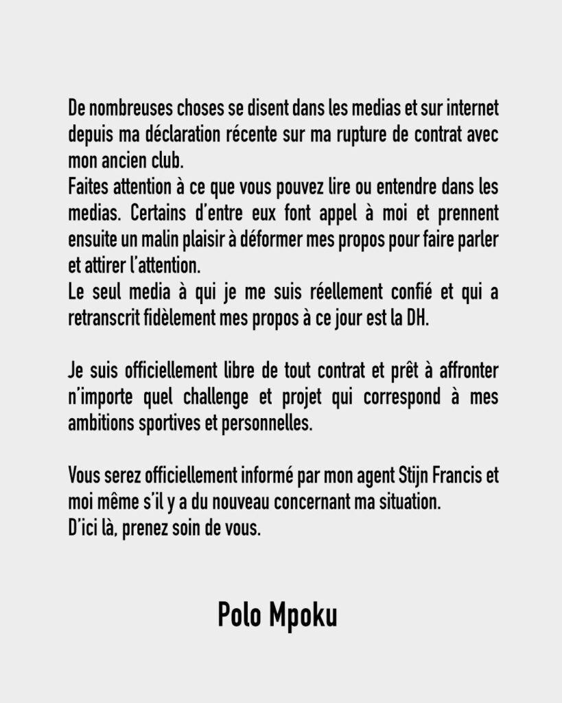 Libre de tout contrat, Polo est prêt à affronter un nouveau challenge. Tout en appelant ses fans à la méfiance vis-à-vis de tout ce raconte, l’ancien médian du Standard de Liège promet d’annoncer prochainement son nouveau club.