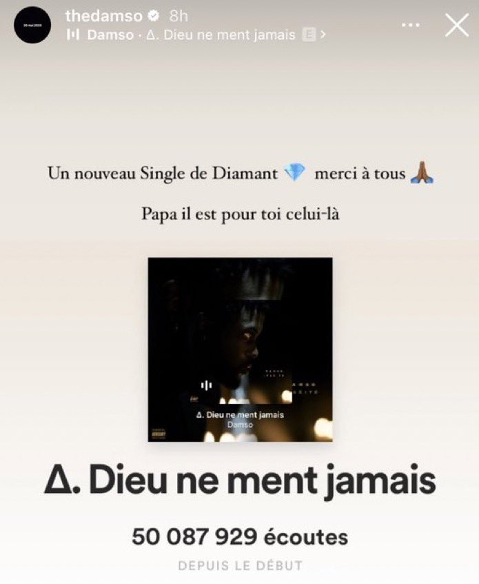 Dans sa page Facebook officielle, Damso a publié un visuel annonçant cette prestigieuse certification. Et en légende de ce post on peut lire : « Un nouveau Single de Diamant, merci à tous », a-t-il écrit avant de dédiées cette victoire à son daron : « Papa il est pour toi celui-là ».