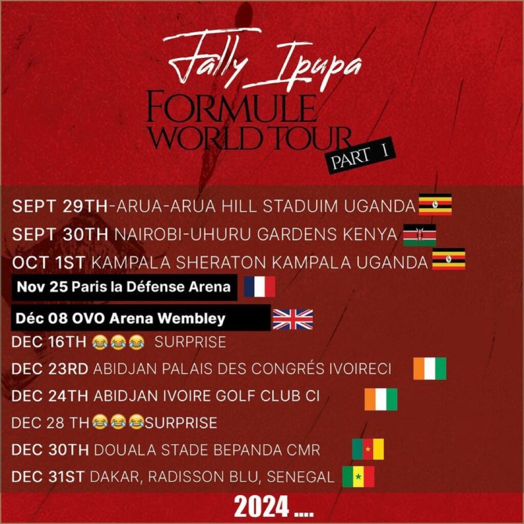 Il vient de dévoiler dans la soirée de ce vendredi 15 septembre les différentes dates de la première partie de sa tournée dénommée « Formule World Tour Part 1 ». Ce tour planétaire comporte 11 prestations scéniques, dont huit en Afrique, deux en Europe, en France et Angleterre ainsi deux autres gardées comme surprises.