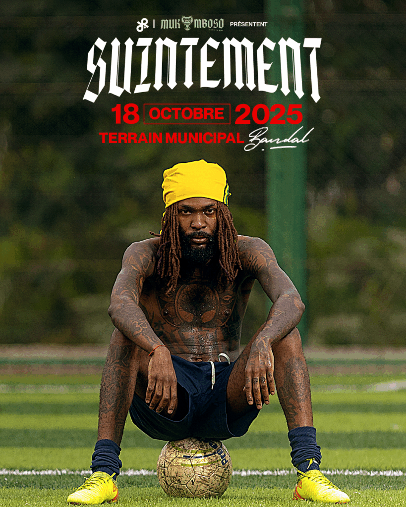 Sur l’affiche, une image forte : Suintement, tel un gladiateur urbain, assis sur un ballon, prêt à marquer un nouveau but dans sa carrière. Un visuel à la hauteur de son parcours et de son énergie.