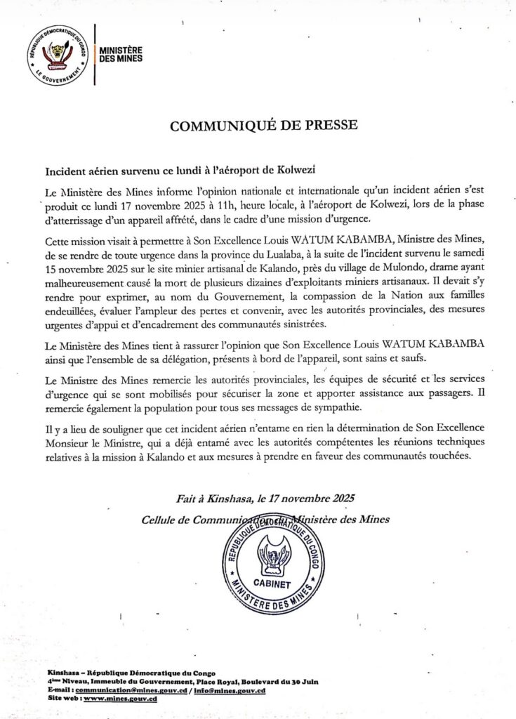 Un incident aérien s’est produit ce lundi 17 novembre 2025 aux environs de 11h à l’aéroport de Kolwezi. Cela est arrivé lors de l’atterrissage d’un appareil affrété transportant Son Excellence Louis Watum Kabamba, Ministre des Mines, en mission d’urgence dans la province du Lualaba.